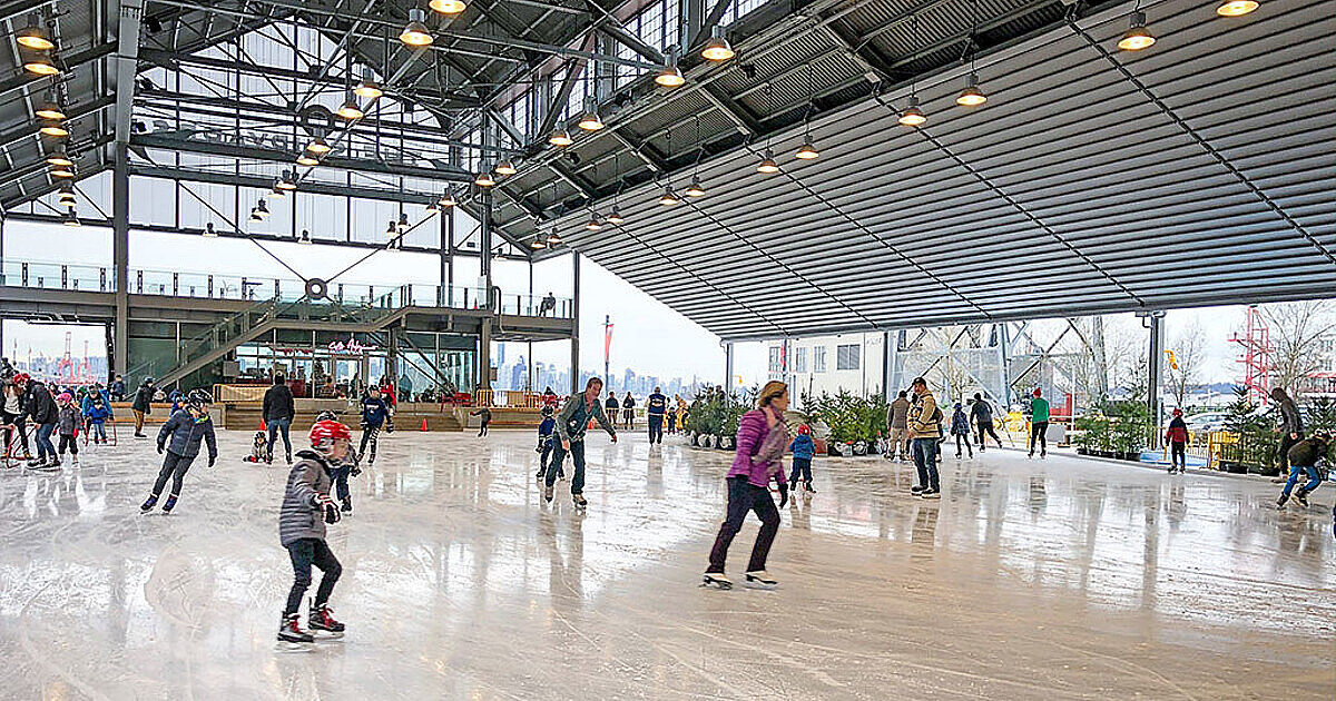 Lonsdale Quay から徒歩すぐの Shipyard で冬の間に解放される無料のスケートリンク。バンクーバーは有名な Robson Square のスケートリンクの約2倍のサイズで最大300名を収容できる広さ。